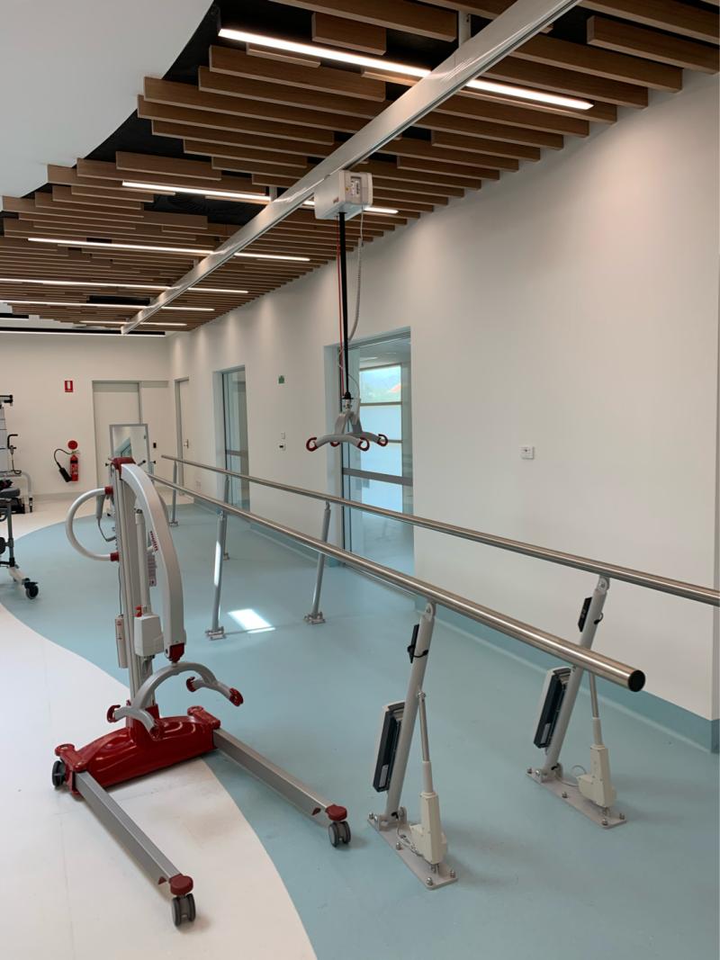 En la siguiente fotografía podemos ver esta magnífica instalación, con una aplicación diferente, de nuestra grúa de techo Molift Air.Esta grúa no sólo sirve para movilizar, también puede contribuir a las tareas de rehabilitación de la marcha.